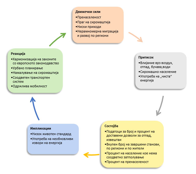 Преминот кон употреба на чиста енергија како резултат на зачувување на животната средина и ресурси и во време кога цените на енергијата од необновливи извори постојано растат, обезбедувањето на подобра енергетска ефикасност има голем потенцијал за намалување на енергетската потрошувачка. Но, употребата и достапноста на т.н чиста енергија е во директна зависност од расположливоста на приходите на населението. Внатрешната миграција исто така става притисок за пренаселеност заедно со изградбата на станови во одредени поразвиени региони. Сето ова креира притисок во непречено одвивање на транспортот, на јавните и приватни зелени површини, отпадот, воздухот и бучава во населените места.