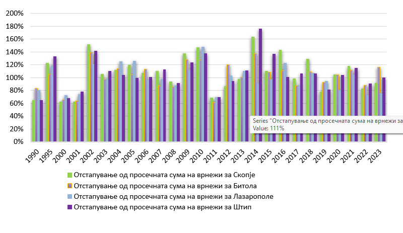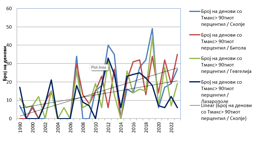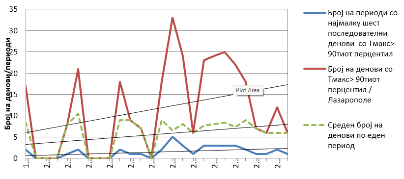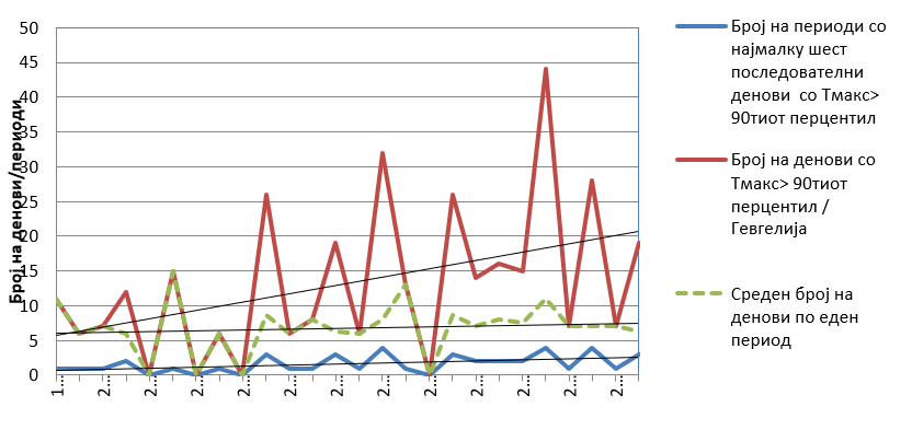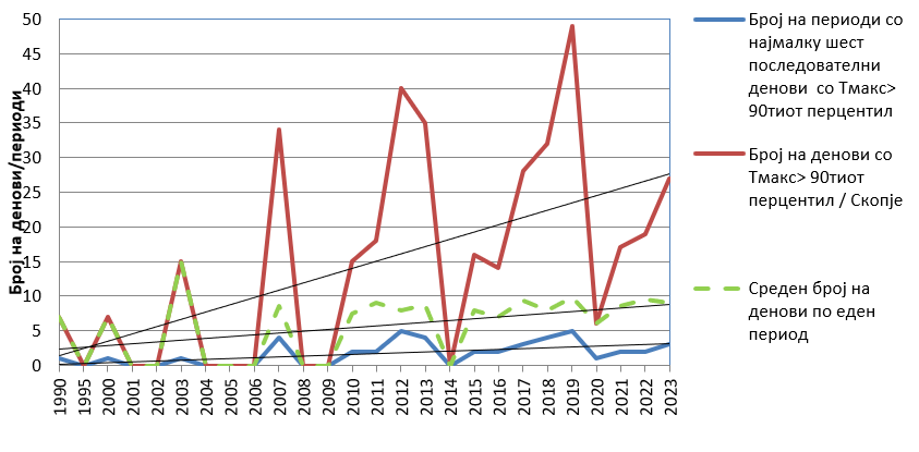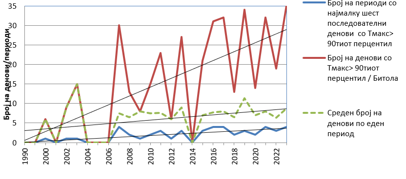Генерално, иако постојат години во кои нема топлотни бранови, во разгледуваниот период (1990-2021) кај сите мерни локации се забележува тренд на пораст на бројот на топлотни бранови, пораст на вкупниот број на денови со Тмакс>90ти перцентил и пораст на средниот број денови по еден период во годините во кои има топлотни бранови.