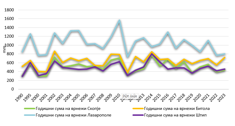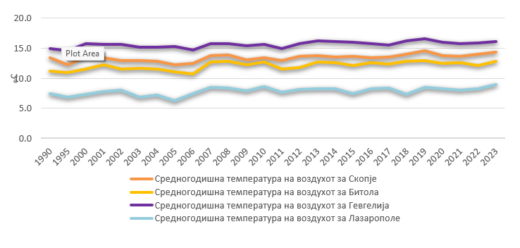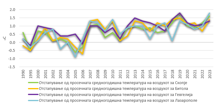 Имајќи го предвид влијанието на емисиите на стакленички гасови, во испитуваниот период може да се забележи покачување на средногодишната температура на воздухот во сите разгледувани населени места во државата, односно позитивно отстапување од просечната средногодишна температура на воздухот, како и покачување на средногодишната температура на воздухот во сите разгледувани населени места, односно позитивно отстапување од просечната средногодишна температура на воздухот. Годишните отстапувања од просечната средногодишна температура во сите разгледувани населени места се движат помеѓу -0,4 и 2,5 °C. Исто така, како резултат на климатските промени се забележуваат и отстапувања од просечните годишни врнежи за период од 1981 до 1990 година се движат помеѓу 62% и 176%.