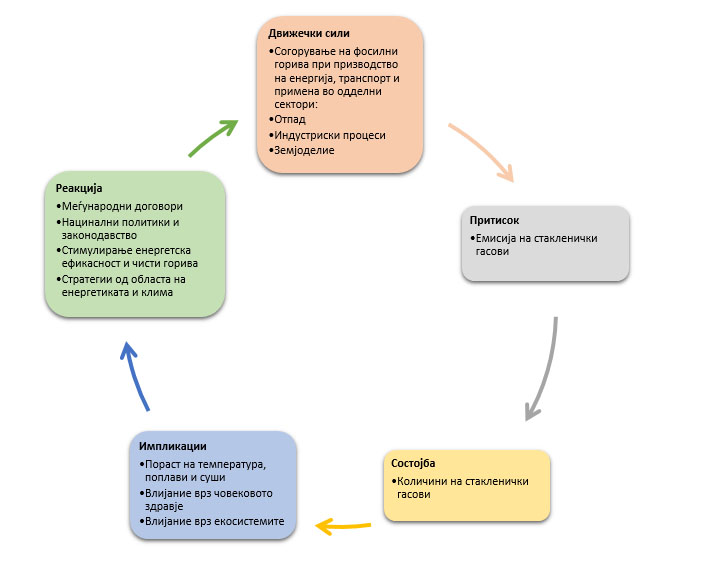Постојат многу “природни” и “антропогени” (човечки предизвикани) фактори кои придонесуваат за климатските промени. Емисиите на стакленички гасови произлегуваат од повеќе сектори и тоа: Секторот енергетика, кој ги вклучува емисиите ослободени како резултат на активностите при кои се согорува гориво, особено нискокалоричниот јаглен, кој се користи за за прозиводство на електрична енергија и има доминантно учество во целокупнито разгледуван тренд; индустриските процеси и користење на производи како резултат на производствените индустрии (особено производство на челик и феролегури и цемент) и од употребата на супститути на супстанциите кои ја осиромашуваат озонската обвивка за ладење и климатизација; Секторот земјоделство, шумарство и други употреби на земјиштето ги опфаќаат емисиите кои се поврзани со сточарско производство и шумски пожари и Секторот отпад кој ги вклучува емисите произлегуваат од депонии за цврст отпад, биолошки третман на цврст отпад, согорување и отворено горење на отпад и третман и испуштање на отпадни води.