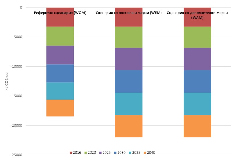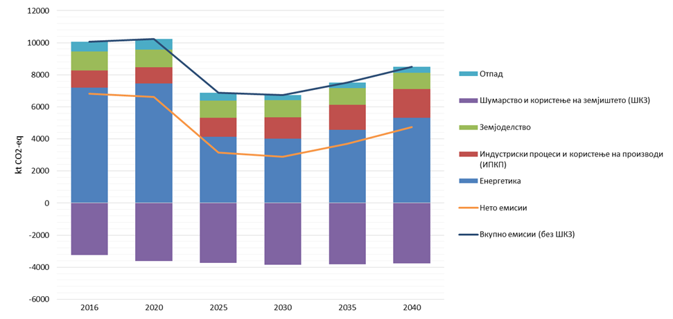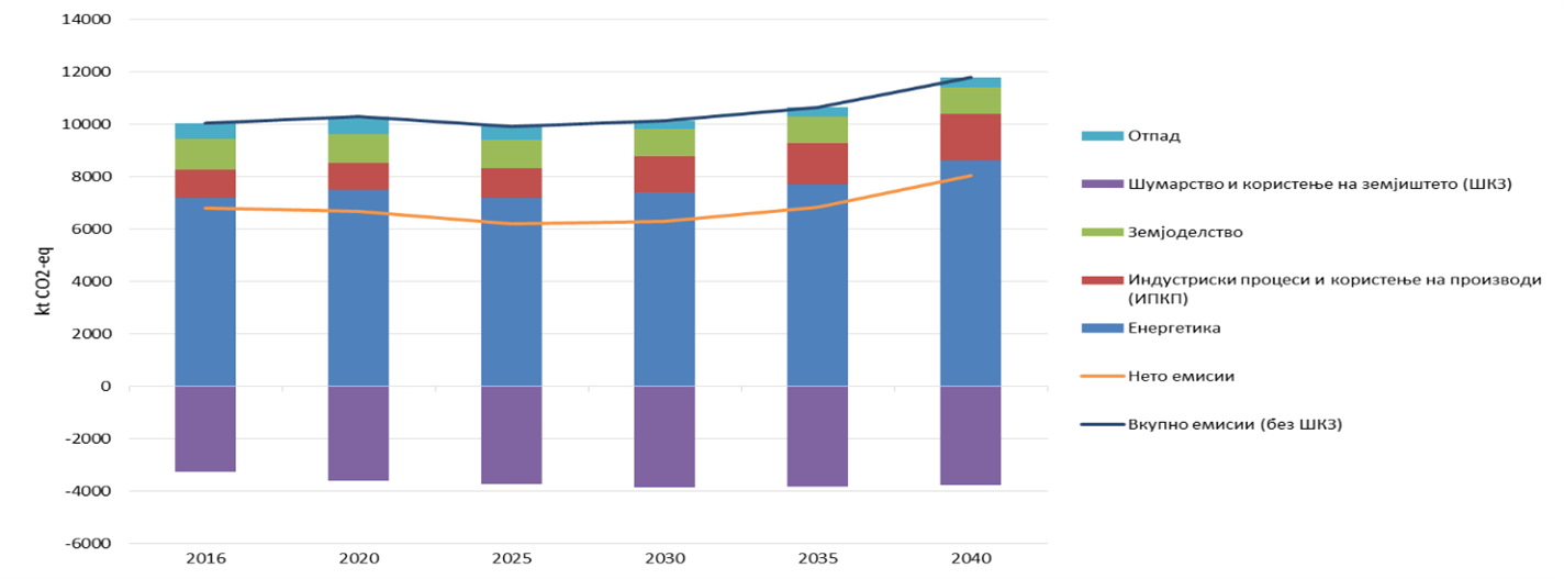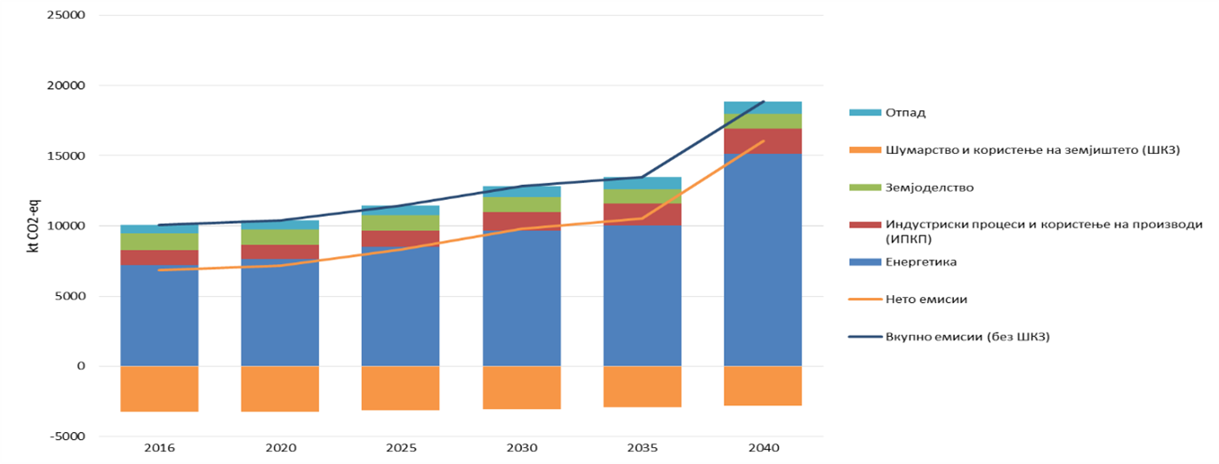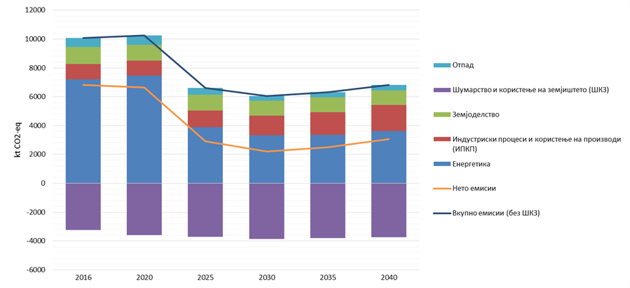 Проектираните трендови на антропогените емисии на стакленички гасови (GHG) се однесуваат на проекции при имплементација на постојни политики и мерки (Сценарио за ублажување, with existing measures – WEM) и дополнителни мерки политики и мерки (Поамбициозно сценарио за ублажување, with additional measures – WAM) и Проширено сценарио за ублажување со дополнителни мерки – e-WAM). (Ублажување на климатските промени, Трет двогодишен извештај за климатски промени). Реализацијата на политиките и мерките дефинирани во WEM сценариото ќе овозможат намалување на GHG емисиите за 37,5% во 2040 година споредено со 2016 година. Дополнително, ако се реализираат политиките и мерките дефинирани во WАМ односно е- WAM сценариото ќе придонесат за намалување на GHG емисиите за 55%, односно 63,9% во 2040 година споредено со 2016 година. (Ублажување на климатските промени, Трет двогодишен извештај за климатски промени)