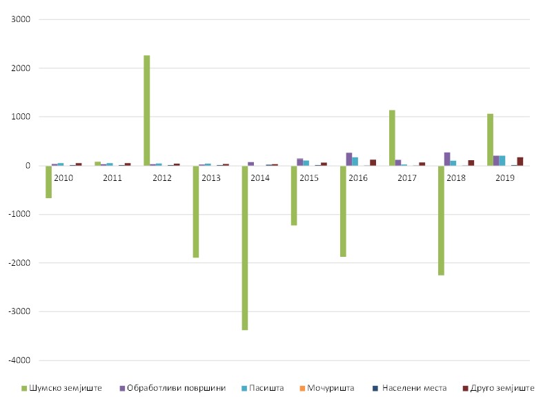 Шумарството со потсекторот земјишта е главен апсорбент на стакленичките гасови во Република Северна Македонија, со исклучок на неколку години, кога појавата на шумски пожари (опожарена површина) била значително поголема од вообичаениот годишен просек. Во текот на годините шумското земјиште, застапеноста на различните типови шуми (листопадни, зимзелени и мешани), како и шумскиот прираст и сеча се релативно стабилни. Просечното апсорбирање на стакленички гасови во секторот шумарство е проценето на 1.608,3 Gg CO2-eq во 2015 година и 2,120.5 Gg CO2-eq во 2016 година. (Инвентар на стакленички гасови, Трет двогодишен извештај за климатски промени)