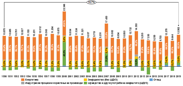 Најголем удел имаат емисиите од секторот Енергетика, со 73,7% во 2016, а после тоа се секторот Земјоделство (без шумарство и други употреби на земјиштето) со 11,8% учество, секторот Индустриски процеси и користење на производи со 8,5% и секторот Отпад со 6%. Учеството на емисиите од секторот Енергетика е доманинатно низ целата временска серија 1990-2016. (Инвентар на стакленички гасови, Трет двогодишен извештај за климатски промени)