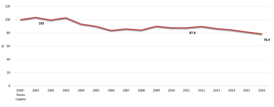 Во споредба со државите од Европската Унија и соседните земји, емисиите на стакленички гасови во Македонија по единица потрошена енергија се ниски. Изразено како индекс во однос на 2000 година (2000=100%), вредноста на овој индикатор во последните години се движи помеѓу 80% – 90%. За државите од ЕУ овој индикатор се движи помеѓу 90% -100%. Во зависност од сценариото, анализите покажуваат дека овој индикатор би можел да се намали и до 65% во 2040 година во однос на 2000 година. (Ублажување на климатските промени, Трет двогодишен извештај за климатски промени).