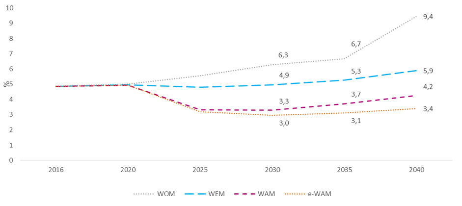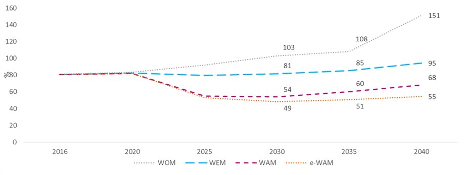 Република Северна Македонија е земја со релативно ниско ниво на емисии по глава на жител. Со реализација на e-WAM сценариото, секој жител на Македонија во 2040 година ќе создава по 3,4 t CO2 -eq, што е за 1,4 t CO2 -eq помалку споредено со 2016 година. За споредба, во ЕУ 28 во 2017 година секој жител создавал по 6,2 t CO2 -eq. (Ублажување на климатските промени, Трет двогодишен извештај за климатски промени)