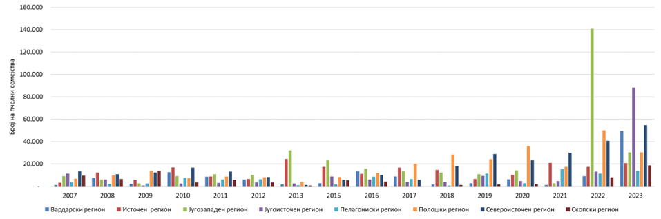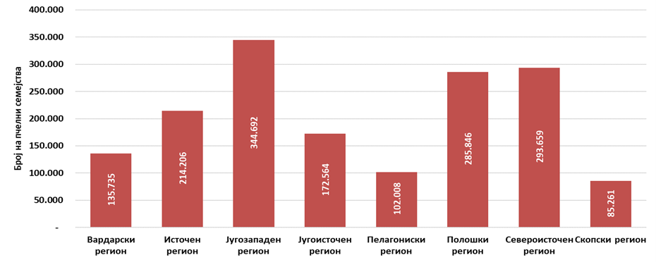 Бројот на пчелните семејства во Република Северна Македонија бележи позитивен тренд на зголемување од 4 пати во однос на 1993 година. Разгледувано по статистички региони, се забележува дека во периодот од 2007 до 2021 година, најголем вкупен број на пчелни семејства (344.692), има во Југоизападниот регион, а најмал (85.261) во Скопскиот регион.