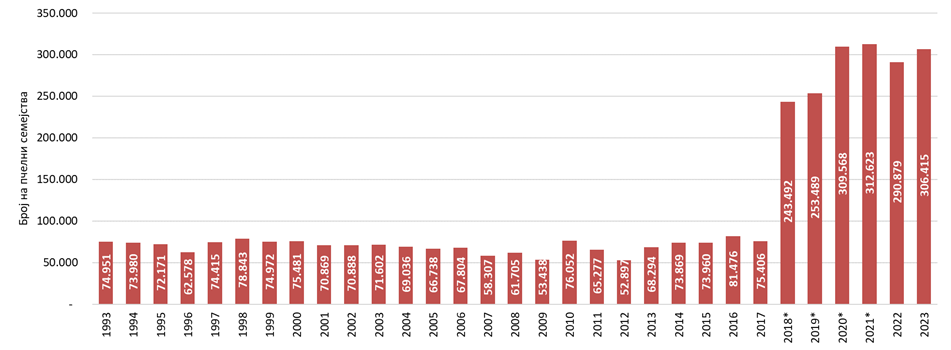 Вкупниот број на пчелни семејства во Република Северна Македонија во 2021 година, бележи позитивен тренд на зголемување од 59,4% во однос на 2007 година.