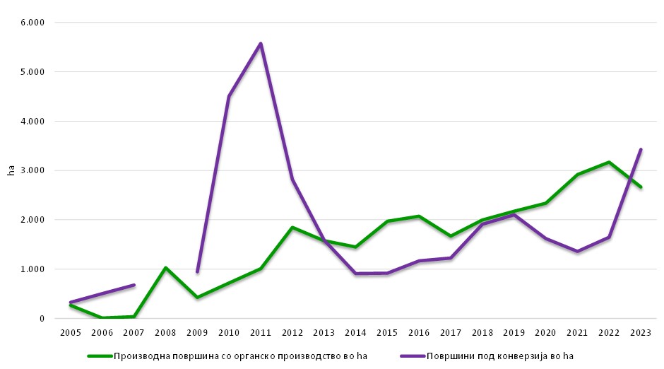 Производните површини и површините под конверзија со органско производство имаат променлив тренд на пораст и опаѓање. Производните површини со органско производство имаат позитивен тренд на пораст од 11 пати, од 266 хектари во 2005 година на 2.664,08 хектари во 2023 година. Површините под конверзија имаат најголем пораст во периодот 2005 до 2011 година, односно од 326.54 хектари во 2005 година се зголемиле на 5.573,66 хектари во 2011 година, што претставува пораст од 17 пати. Но потоа, во периодот од 2011 до 2014 година има најголем пад на површините под конверзија од 5.573,66 хектари на 910,88 хектари, што укажува на фактот дека во тој период значително се намалуваат површините под конверзија. Позитивен тренд на зголемување со одредени флуктуации на површините под конверзија се јавува во годините од 2015 до 2023 година.