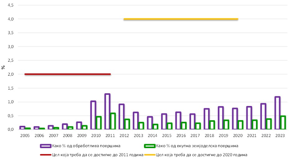 Исто така целта не е постигната и согласно проекциите дадени во националните стратегии за земјоделство и рурален развој 2014-2020 и 2021-2027 година. И покрај зголемувањето на производните капацитети за органско производство во изминатиот период посакуваните проекции на политиката за удел на обработените површини под органското производство се под 2% од вкупното обработено земјоделско земјиште во Република Северна Македонија.