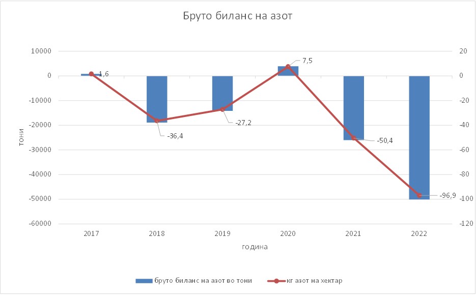 Повторно е направена анализа на Бруто-Билансот на азот за периодот од 2017 до 2022 година, при што забележлив е променлив тренд на бруто-билансот на азот во нашата земја. Прво е забележан пад, па веднаш потоа раст на истиот до 2020 година. Потоа следи нагло опаѓање во периодот од 2021-2022 година на бруто-билансот на азот изразен како во илјади тони, така и во килограм азот на хектар земјоделска површина kgN/ha. Постојан суфицит индицира потенцијални проблеми со животната средина, додека постојан дефицит во азотниот биланс, индицира потенцијален ризик за намалување на хранливите материи во почвата.