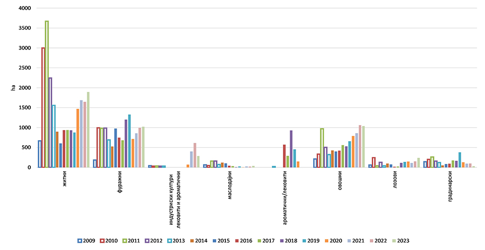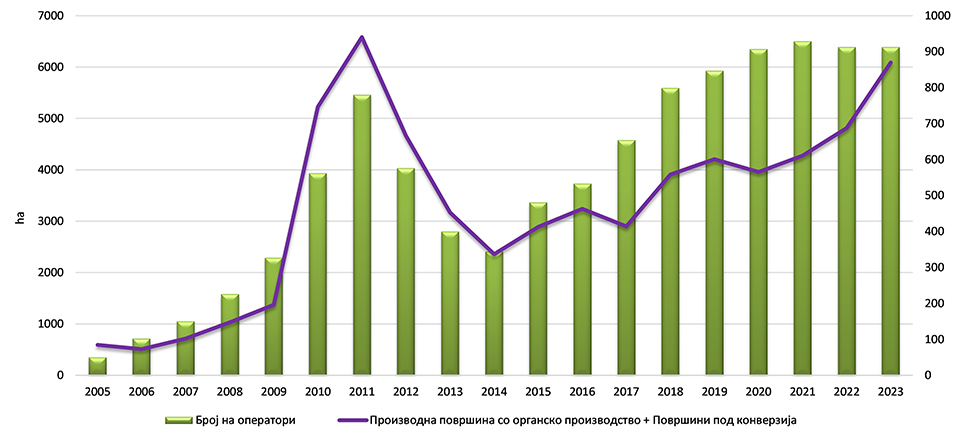 Во последните години се забележува тренд на пораст во органското производство, како во обработливите површини сертифицирани за органско производство, така и во бројот на оператори. Производните површини со органско производство имаат позитивен тренд на пораст од 11 пати, од 266 хектари во 2005 година на 2.664,08 хектари во 2023 година. Површините под конверзија имаат најголем пораст, од 17 пати, во периодот 2005 до 2011 година, а најголем пад во периодот од 2011 до 2014 година. Позитивен тренд на зголемување на површините под конверзија се јавува повторно од 2015 до 2023 година.