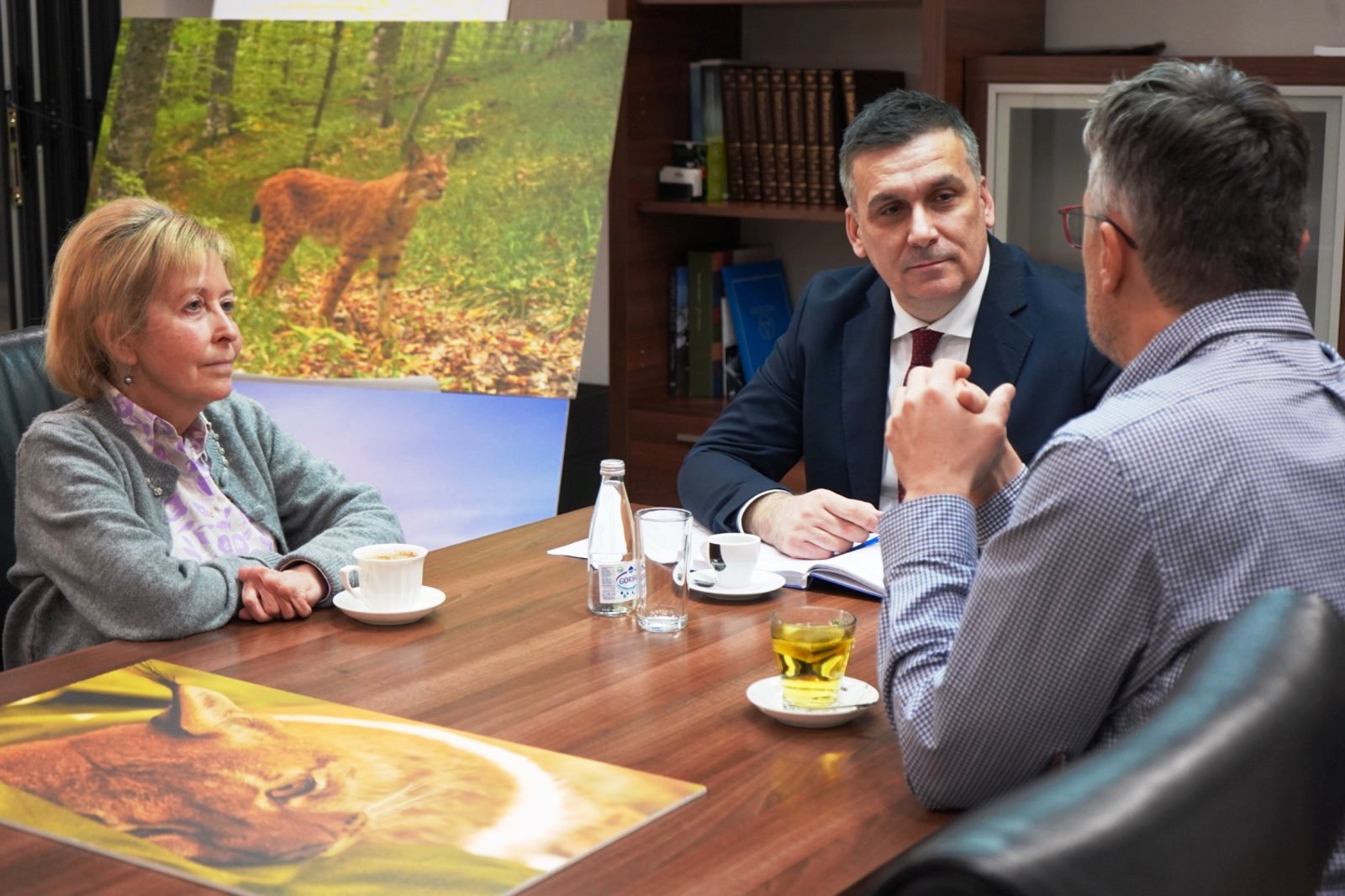 На средбата со Робертина Брајаноска, извршна директорка на друштвото, и Диме Меловски, раководител на Програмата за диви видови, во фокусот на разговорите беше потребата од посилна институционална поддршка, како и интензивирање на прекуграничната соработка со Албанија и Косово, со оглед на тоа што дел од популацијата на балканскиот рис се движи и надвор од границите.