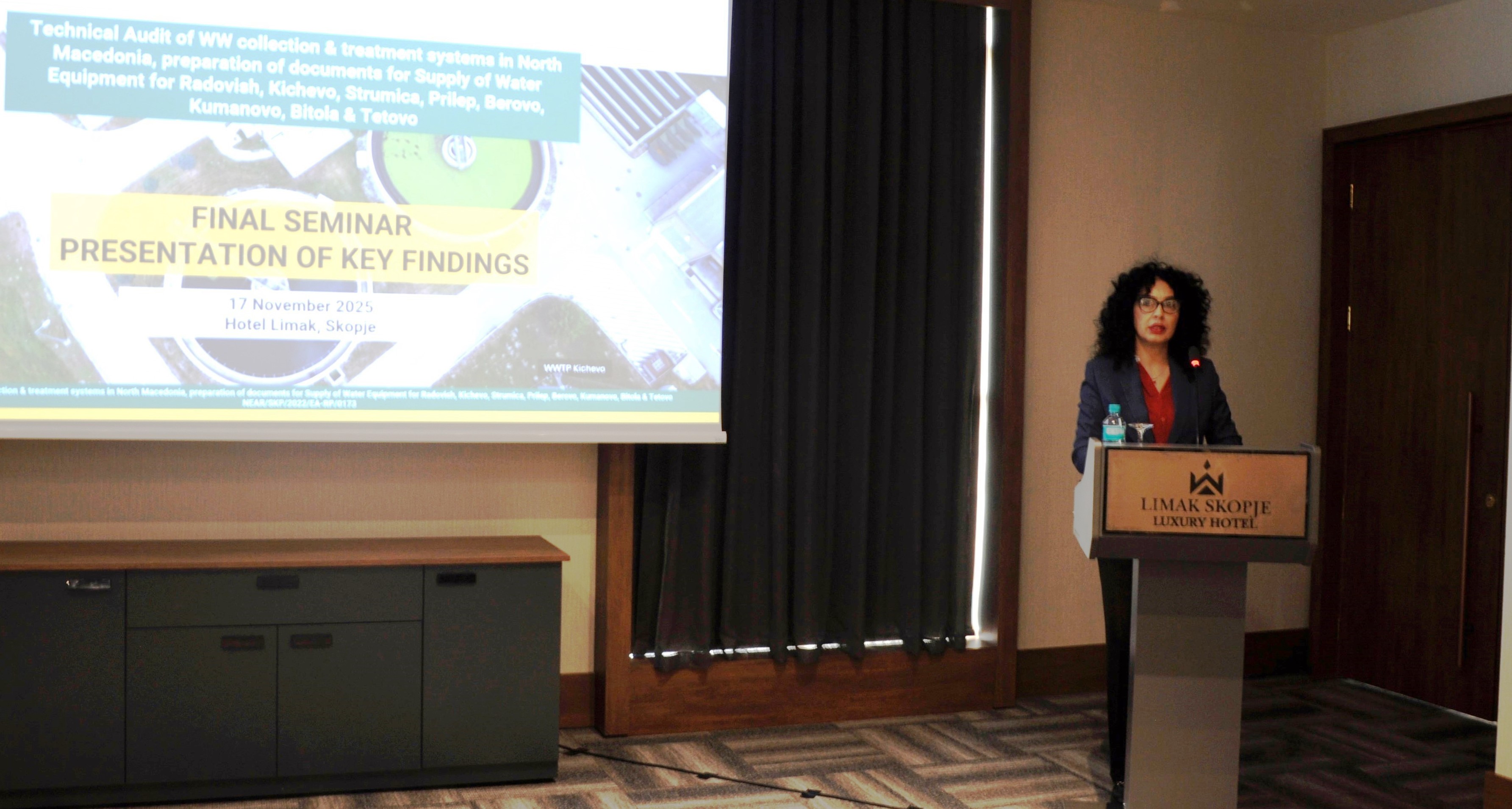 Заменик министерката за животна средина и просторно планирање, Ане Лашкоска, денес во Скопје се обрати на завршниот настан од конференцијата „Презентација на главните наоди од Техничката ревизија“, во рамки на проектот „Техничка ревизија на системите за собирање и третман на отпадна вода во МК и подготовка на документи за набавка на водоводна опрема за Радовиш, Кичево, Струмица, Прилеп, Берово, Куманово, Битола и Тетово“.